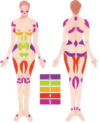 容易脂肪囤積的部位依照1~5做區分級,我們可以看到最容易囤積的部位在於臀部,以及側腰以及後腰部,次來為大腿內外側等部位。