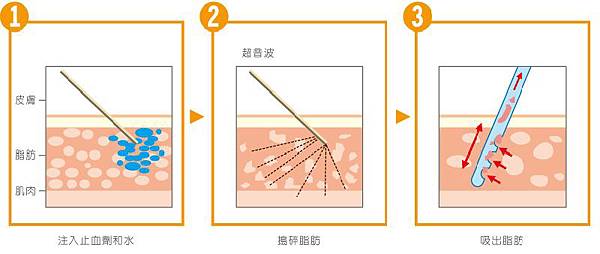 抽脂的方法:將膨脹劑打入深層脂肪層使脂肪組織鬆軟,順便藉由膨脹劑裡的局部麻醉劑與血管收縮劑使血管收縮以達到減少出血量,降低危險性。