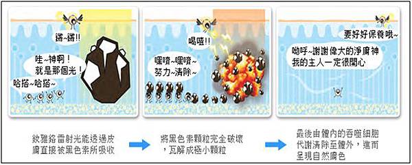 l 1064nm波長:可穿透到較深的真皮層去治療深層色素斑及去除黑藍色刺青。而深層斑點的治療是將黑色素顆粒破壞瓦解成及小顆粒,再由體內的吞噬細胞將之清除。