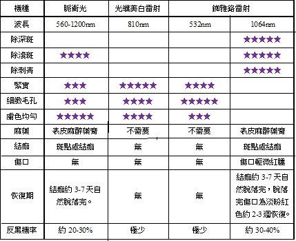 l 532nm波長:屬於溫和、非侵入式,藉由光熱作用刺激真皮組織的纖維母細胞使膠原蛋白增生,回復肌膚彈力並縮小毛孔。針對表皮色素斑進行治療,淺層斑點的治療術後會產生痂皮,約一週左右脫落。