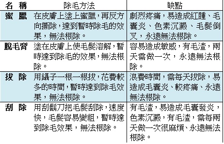 - 雷射無法處理隱藏在毛孔內休止期及退化期的毛髮,必須在數月內反覆治療,整個療程需耗時半年。