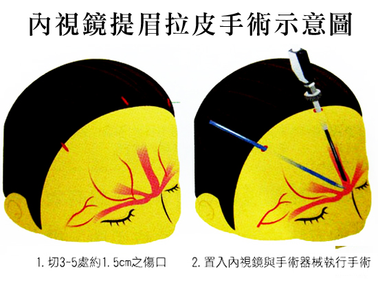 內視鏡拉皮手術是利用約1.5公 分左右的小傷口,將內視鏡從其中一個切口放入,內視鏡裡的攝影機連接在監視器螢幕上,精細的組織結構經過放大後在監視器螢幕上一覽無遺,配合另一切口放入 的專用手術器械,就能夠很精確地進行手術,因此能避免傷口過長,並使傷口癒合更快,病人復原時間縮短,臨床經驗顯示病人的疼痛也相對減低很多,術後疤痕也 比傳統拉皮手術不明顯。