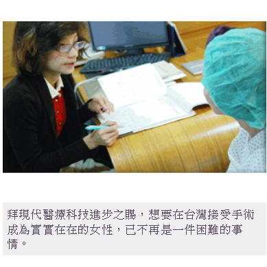 除了在國外,拜現代醫療科技進步之賜,想要在台灣接受手術成為實實在在的女性,已不再是一件困難的事情。台中整形外科醫師朱純慧表示,大部分想要變成女性的就診民眾,第一個步驟多半是進行隆乳;其次,就是將男性的水桶腰身改變成富有女性韻味的小蠻腰。